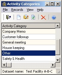 The following screen appears listing all the current activity categories: