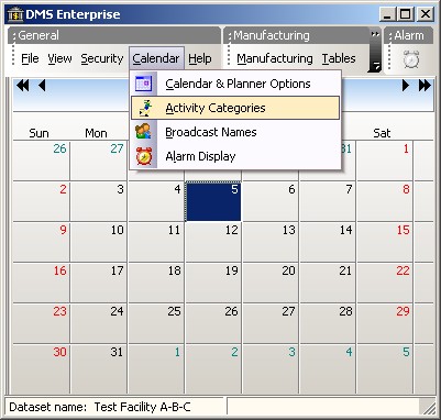 Activity categories are a way of categorizing activities added to DMS. Activity categories are optional but if they are used each category must be unique; duplicates are not allowed. To access the activity categories, select Calendar | Activity Categories as in:
