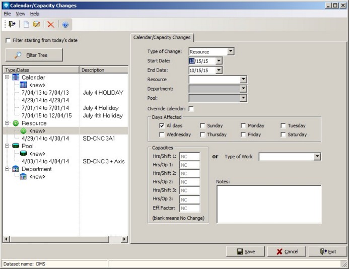 You can select calendar/capacity changes starting from today's date by checking the prompt "Filter starting from today's date" located above the tree. After you check this selection and press either the Enter or Tab key, the tree will display all calendar/capacity changes starting from today's date forward.