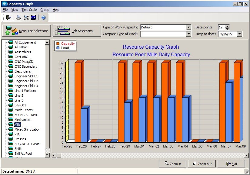 - Resource Count If View | Resource Count is selected, the number of resources (labor or machines) for each time period is displayed on the graph as a cyan colored bar. DMS calculates the resource count by: Hours per Shift / Hours per Operation.