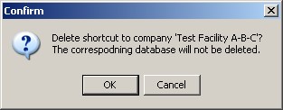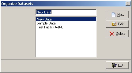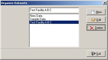 The following example shows how to delete the dataset Test Facility A-B-C. First, Text Facility is selected from the list and then the Delete button is clicked: