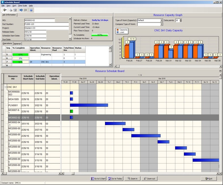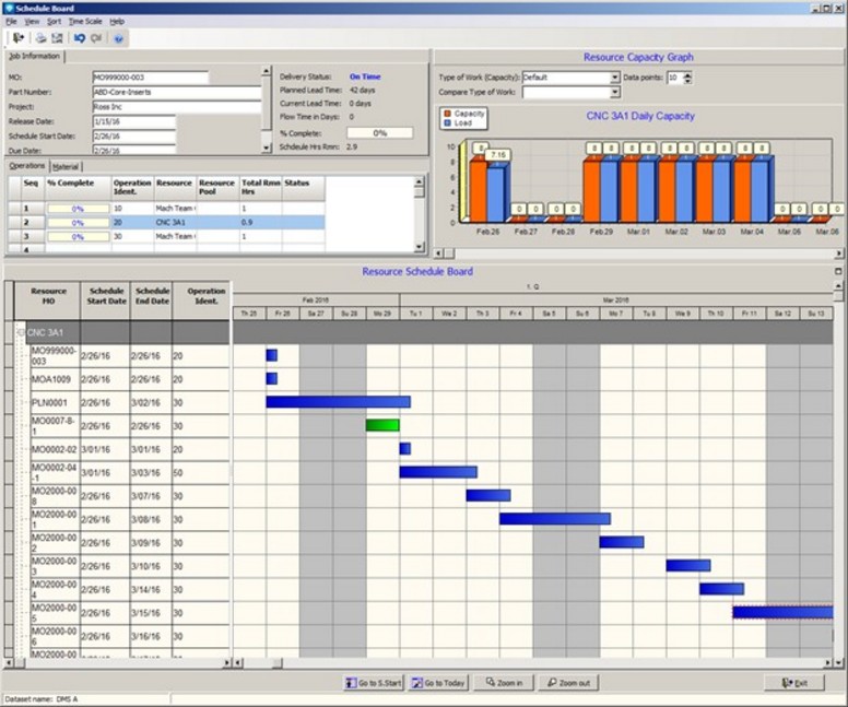 The Schedule Board is an excellent tool to view the results of a schedule run as well as enabling you to make any desired manual changes before the results are dispatched to the shop floor. You can gather similar operations together, adjust operations to fit on certain day, select to load operations infinitely for future schedule runs, lock an operation on the selected dates, move an operation to a new resource, and more.
