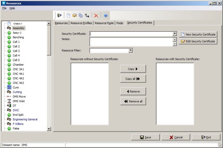 The window below shows an example of the Security Certificates tab in Resources: