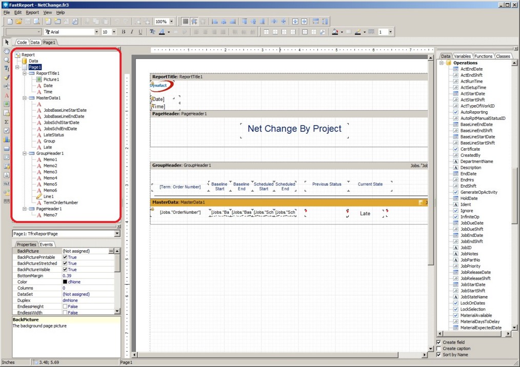 The list of report objects accessible from the script is shown in the “Report tree” pane. To view the Report Tree, select View | Toolbars | Report Tree. The example below shows the Report Tree circled in red at the top left side of the Report Designer: