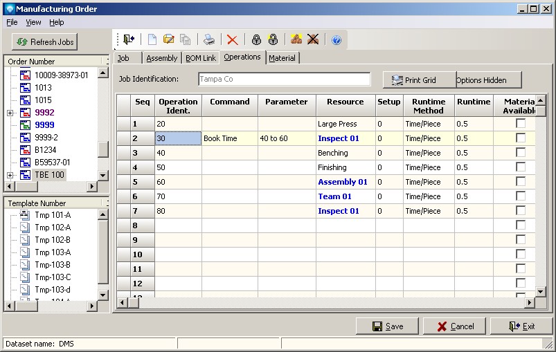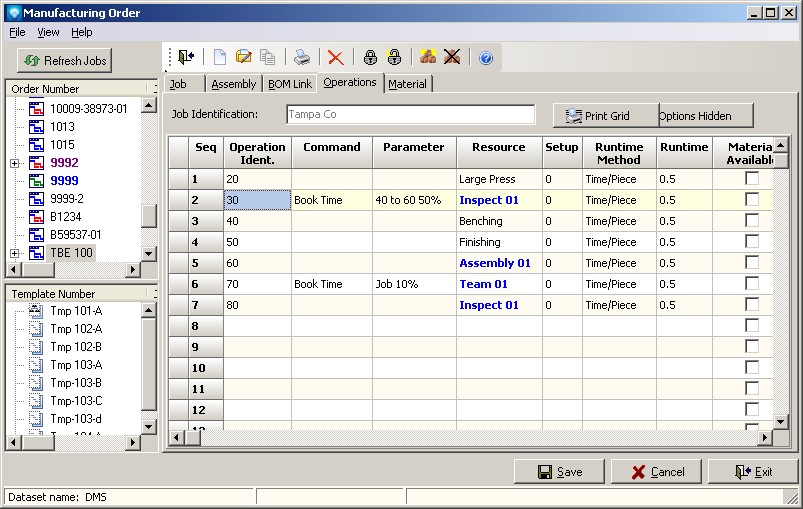The example below books operation 30 for the 50% of the time it takes to do operation 40 through to operation 60. Operation 70 is booked for 10% of the time for the entire job: