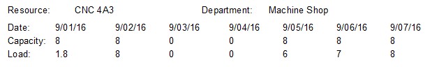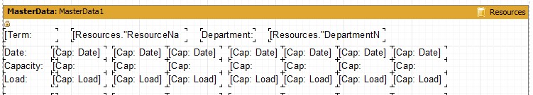 In the example below, on the Master data band there is a heading with the Term: Resource, the resource name data field, the text filed with the word "Department:" and the resource's department data field. On the left side of the report we have listed vertically "Date:", "Capacity:", and "Load:". After that we have the three capacity fields listed vertically "Cap: Date", "Cap: Available" and "Cap: Load". Note that since the "Cap: Available" field has been resized, the field appears on the report below as "[Cap: ]":
