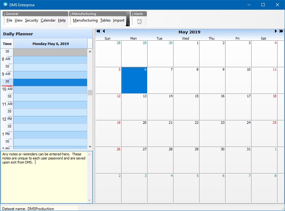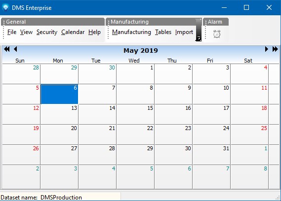 After you log in to DMS (or if you bypass the database login) you are presented with a calendar showing the current system month and day. The menu across the top of the calendar enables you to access the various parts of DMS: