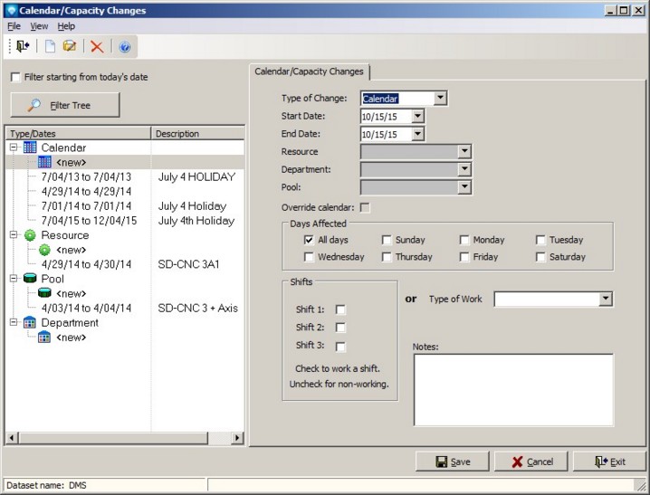 You can select calendar/capacity changes starting from today's date by checking the prompt "Filter starting from today's date" located above the tree. After you check this selection and press either the Enter or Tab key, the tree will display all calendar/capacity changes starting from today's date forward.