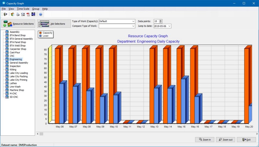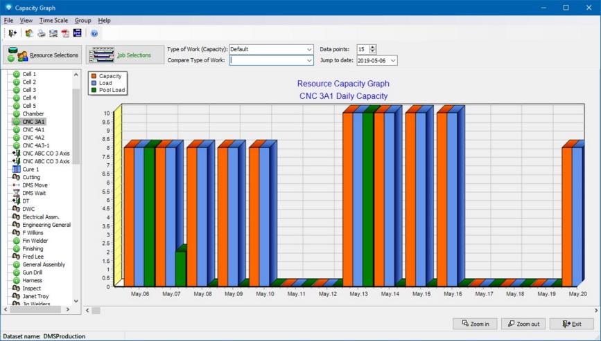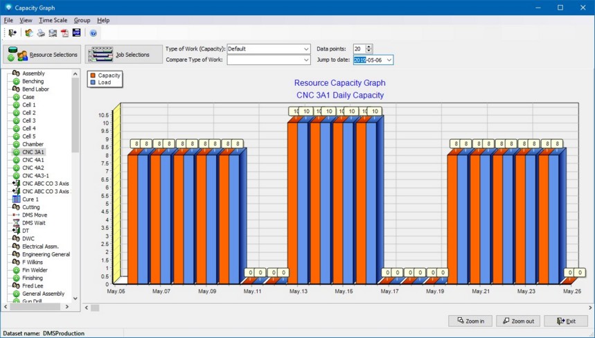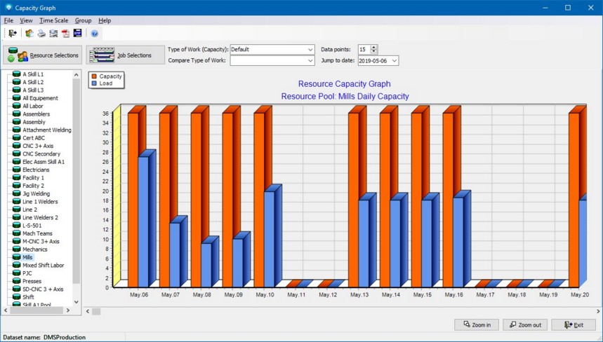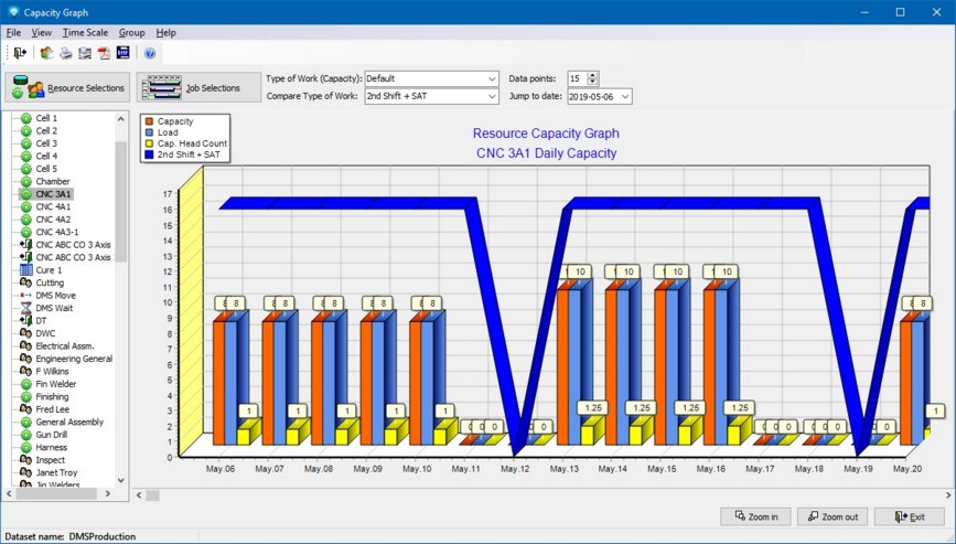 - Resource Count If View | Resource Count is selected, the number of resources (labor or machines) for each time period is displayed on the graph as a cyan colored bar. DMS calculates the resource count by: Hours per Shift / Hours per Operation.