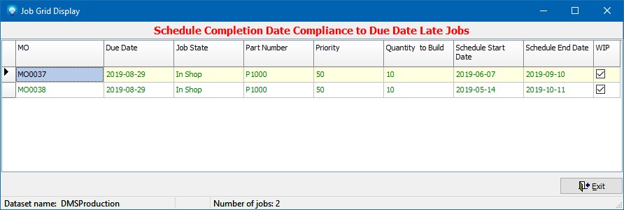 You can view the jobs that make up each of the bars in the bar graph by clicking on a bar. For example, if you wanted to view the two late jobs in the Schedule Completion Date Compliance to Due Date, you would click on the Jobs Late red bar. The following grid of jobs would then be displayed:
