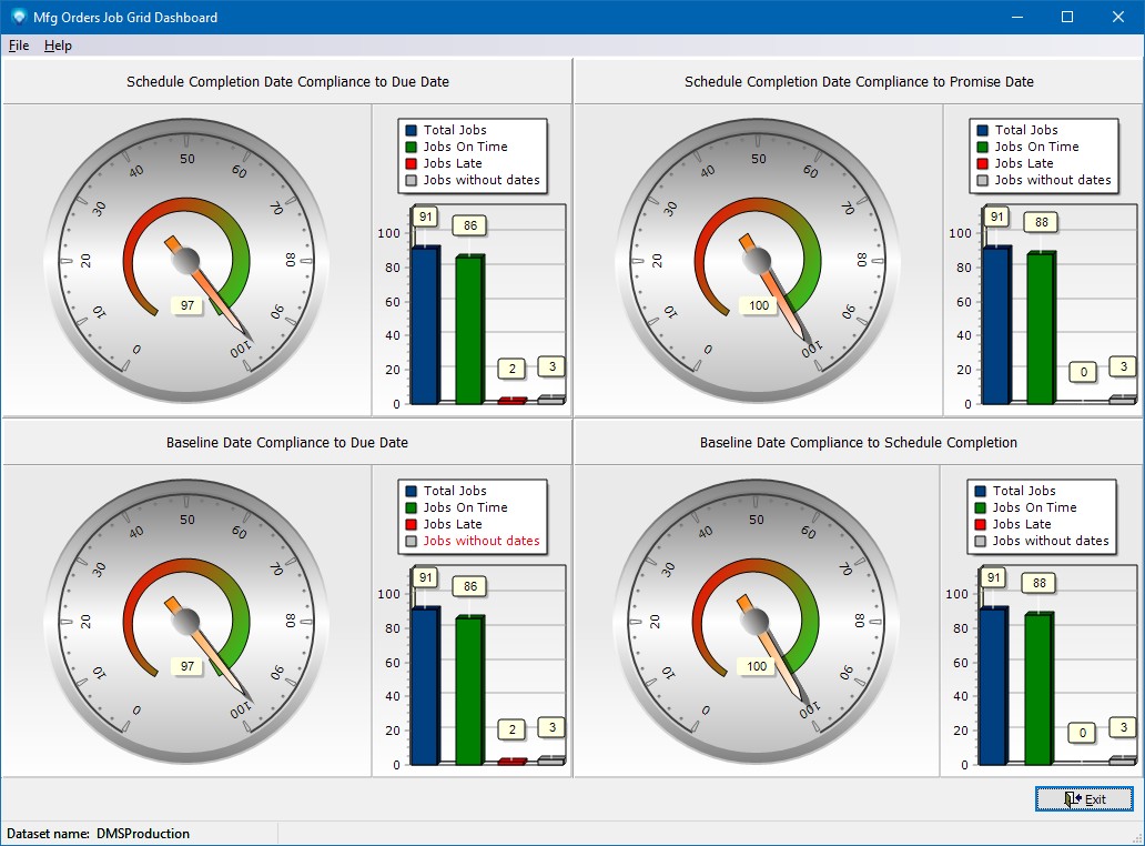 The Mfg Orders Job Grid Dashboard enables you to take a quick snapshot of on-time performance. The Dashboard displays four measurements of compliance: