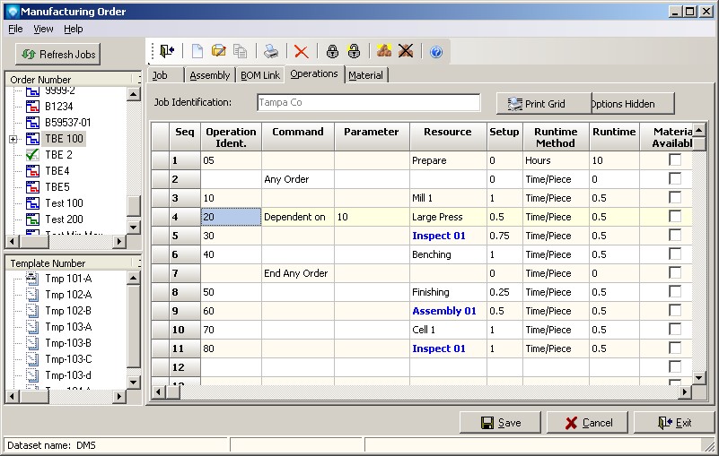 The Dependent On command is used with the Any Order command to specify that some operations are dependent on other operations. In certain instances in manufacturing there may be an Any Order grouping of operations where some operations must occur after other operations. For example, let's say we have 4 operations 10, 20, 30 and 40, that may occur in any order as long as operation 20 is done after operation 10. We would then say that operations 10, 20, 30 and 40 can be performed in any order with the added relationship that 20 is dependent on 10. The Dependent On command would then be used to tell the scheduler that operation 20 is dependent on operation 10.