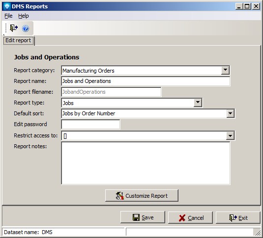 The following window appears with the name of the report you are editing (in this example, we are going to edit the "Jobs and Operations" report). You can edit two parts to the report; the report header (as in the example below) and the report itself using the DMS Report Designer: