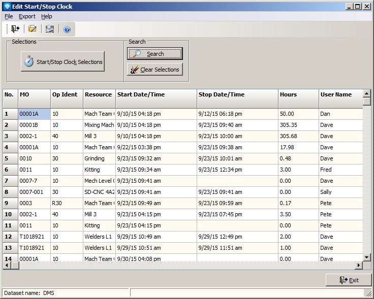 Example screen below shows the Edit Start/Stop Clock grid with "Order Number" renamed to "MO":