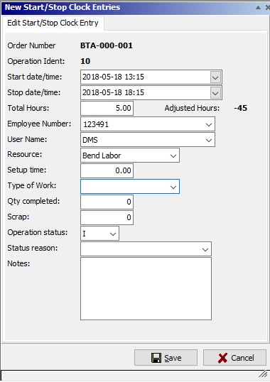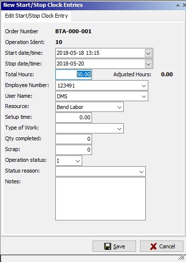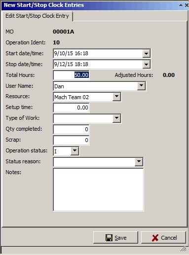 Click on the Save button to update the new start/stop clock entry, apply the changes to the job and operation, log the entry in the job status transaction log, and close the New Start/Stop Clock Entries window. Click on the Cancel button to cancel the entry and close the New Start/Stop Clock Entries window.