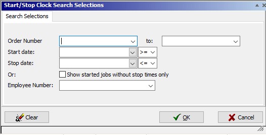After the search selections have been entered, press the OK button to close the Start/Stop Clock Search. To perform the search after entries have been made, click the Search button on the Edit Start/Stop Clock window. Click the Cancel button to ignore the search selection entries.