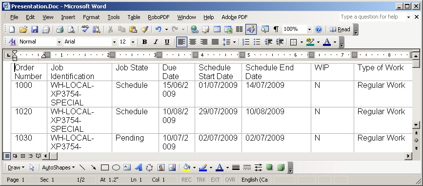 The Word DOC format is in Microsoft Word format.  The grid contents are written into a table within word.  The following examples shows Word displaying a DOC file exported from DMS.  Note that you may have to change the page setup and the column widths to get the results you want.