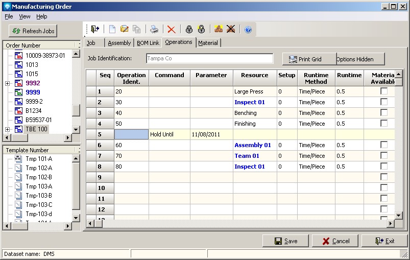 The Hold Until command tells the scheduler to not start the next operation start until the date given by Hold Until command.  In the example below, operation 60 cannot start until 11/08/2011.  Note that the Hold Until command must be on its own line (Seq 5 in the example below) and cannot have an Operation Ident.
