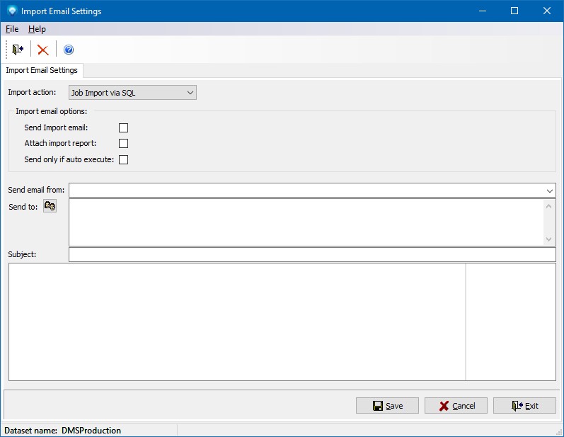 When information is imported into DMS using a SQL script or a text file, DMS can optionally send an email to let you know the status of the import.  Emails can be sent for the following imports: