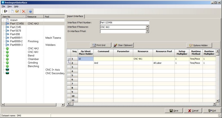 The Import Interface Table enables you to modify and add to operations that are being imported via SQL or a text file. As each operation is read in, and if the operation has a match in the Import Interface Table, the operation is modified and extra operations can be added to the import. For example, for all jobs of part number Part123456 who has a resource CNC 43A we could change the resource to be CNC 431 and add an operation line with a DMS command of AND and a pool of All Labor.