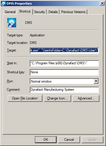 The screen example below shows the properties of the DMS shortcut icon on the desktop. The target to execute the DMSEnt.EXE is "C:\Program Files (x86)\Dynafact\DMS\". The DMSUser.INI file is located in the UserIniFolder C:\Dynafact\DMS\User\. This is specified be the parameter “UserIniFolder = C:\Dynafact\DMS\User\”. Note that both the executable file location and the UserIniFolder parameter have been surrounded by double quotes. The entire target line is: