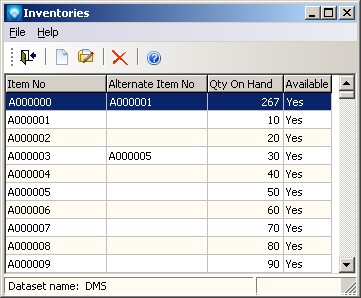 When you select Tables | Inventories, the following windows appears listing the current inventory items: