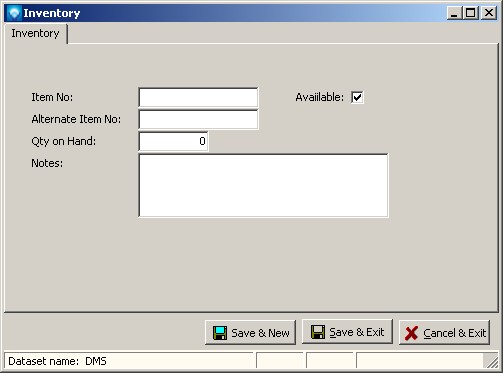 Inventory is used for Material Requirements, specifically the Material Details Level. Material can be entered manually or loaded via a text file using Import Inventory. Before an inventory item can be used, the inventory item must be defined. Once a inventory item has been defined and is used by DMS, it cannot be deleted unless the operations using the inventory item are reassigned. Instead of deleting an inventory item you can make it unavailable for use by unselecting the Available check box.