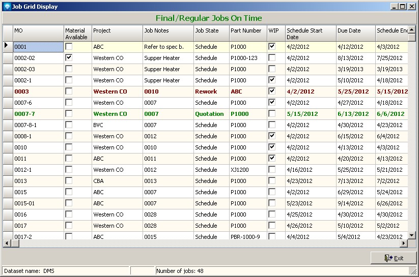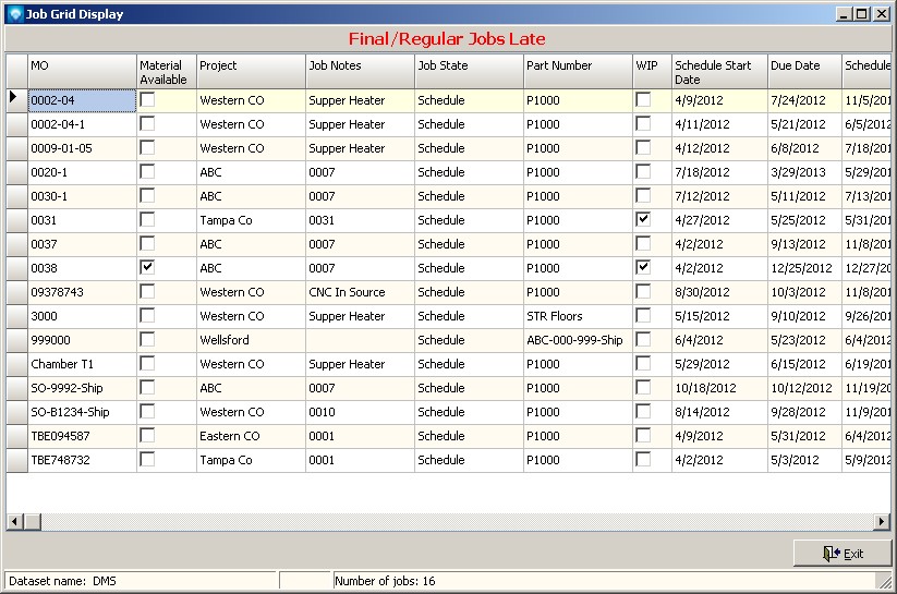 Depending on the pie slice you clicked on, the Job Grid Display will display the title of the corresponding pie slice. In the example below, the user clicked on the pie chart slice for jobs on time: