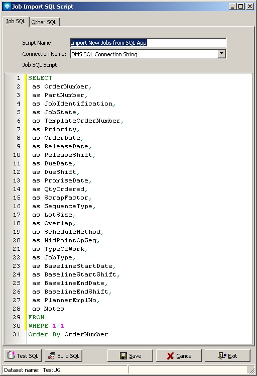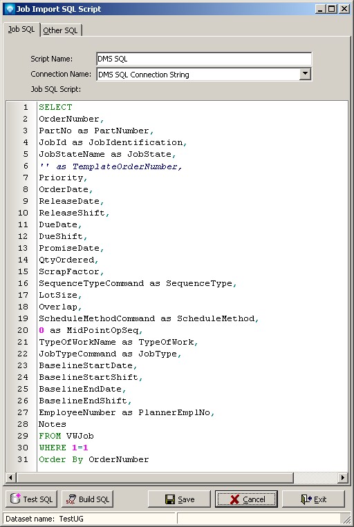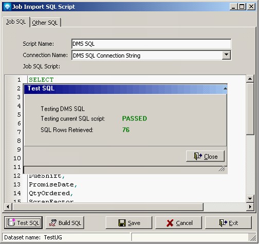 The Job Import SQL Scripts are where you define the SQL to import jobs from an external database into DMS. Before you add the SQL scripts, one or more connection strings must be defined. Any number of SQL import scripts can be defined. For help writing SQL scripts in DMS, please see Hints and Tips Writing SQL Scripts.