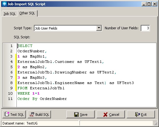Note that for user fields you must enter the number of user fields that will be imported. For example, if you have three job user fields to be imported, enter 3 to the Number of User Fields. DMS will build the corresponding SQL as follows: