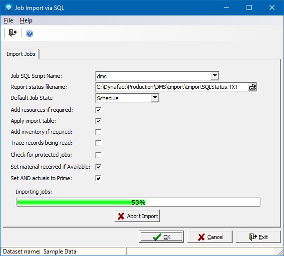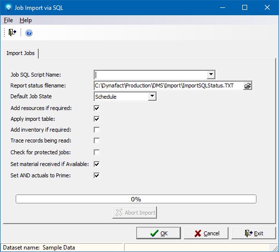 The Job Import via SQL windows will appear as in the example below: