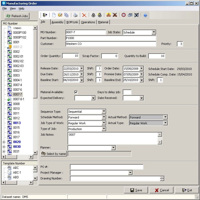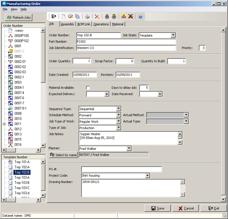 The example below shows a template job.  Note that the date section of the screen is different from the date section of a non-template job.  All other information is the same.  A template job is usually planned for one piece and does not have its material information completed (i.e. Material Available is not selected and the expected delivery and date received are blank) with the exception of the Days to delay job which may be a standard number of days for the template job.  User fields are filled in as required for a template job: