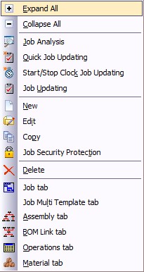 If you right click on the job tree, the following pop up menu appears.  The appearance of pop up menu will depend on the selections you have made in Terms and Settings as well as Material Options:
