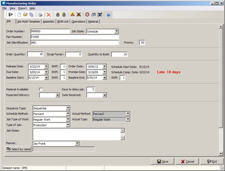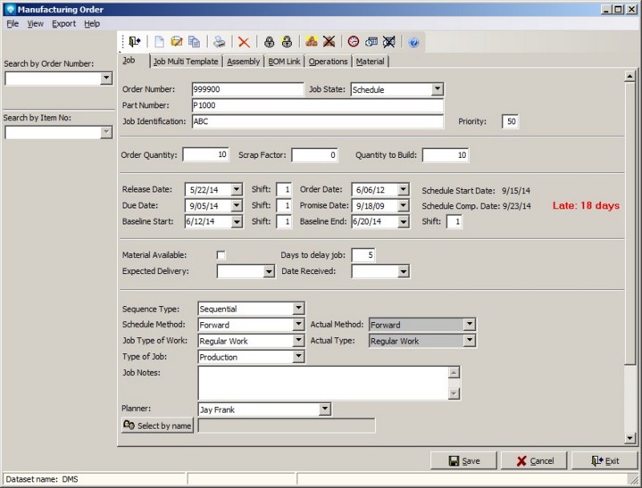 The screen example below shows how the Manufacturing Order screen will appear if the option “On external edit hide trees” is selected and you are editing a job from a display or a graph. Note that the job trees on the left side of the screen are hidden: