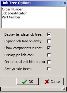 To access the Job Tree Options, select View | Job Tree Options from the Manufacturing Order (job details) screen. The following window appears: