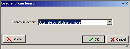 The previously saved searches are sorted by their names in alphabetical order. From this window you can select the search you want to execute or delete an existing search. To select a search to execute, either enter the search name or use the drop down menu. Once you have selected the search, click OK to close the window and execute the search, or click Cancel to cancel the load search and close the window. Note that a saved search cannot be edited.