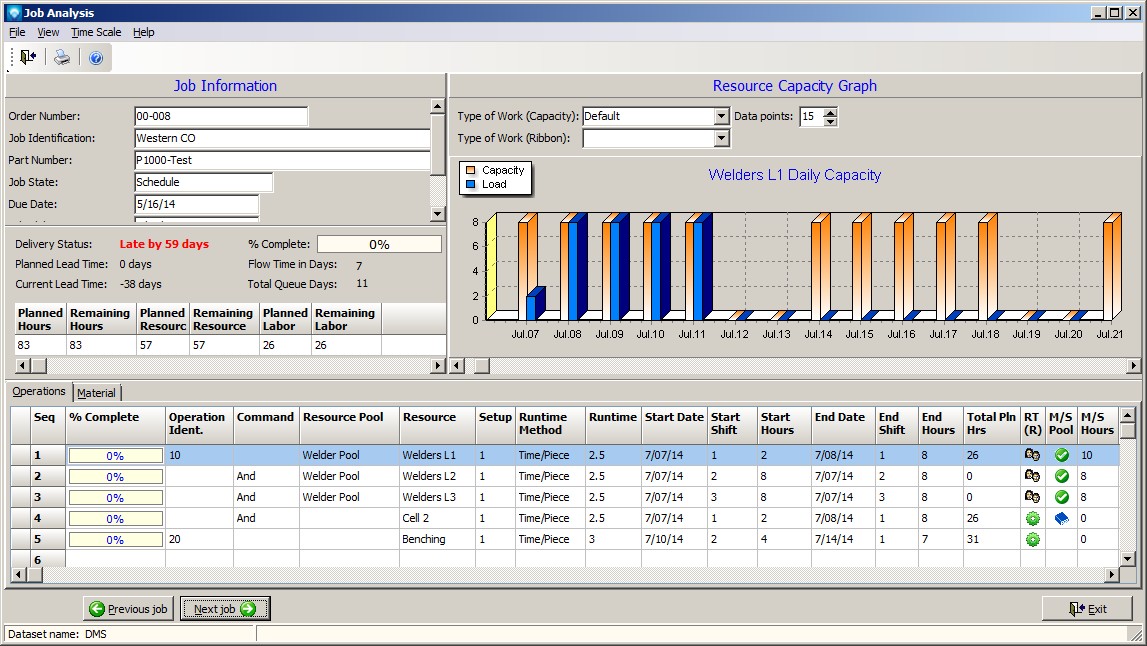 M/S Hours (multi shift hours) are the individual hours assigned to each Multi Shift Pool shift and is set by the scheduler. For example, if an operation requires 26 hours to be completed on an M/S Pool and all three shifts are available, the scheduler may assign 10 hours to shift 1, 8 hours to shift 2 and finally 8 hours to shift 3. These individual hours of 10, 8 and 8 are shown in the M/S Hours column while the total planned hours of 26 is shown on the prime operation only as in the Job Analysis screen example below: