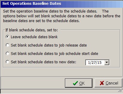 Before the baseline dates are set, you can optionally set blank operation schedule dates.  Operation schedule dates may be blank if the job was loaded from a text file or by an SQL import and the host system has the operation schedule dates set to blank for operations with a status of complete.  (Blank operation status or operations with a status of in process will have their schedule dates set when the schedule is run.)
