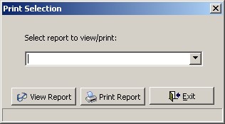 The example below the window that appears when you select Print Reports from a module.  Select the report from the drop down list and then click on the View Report or the Print Report button.  The report will than be displayed/printed.  Selecting Exit will close the window without displaying or printing the report: