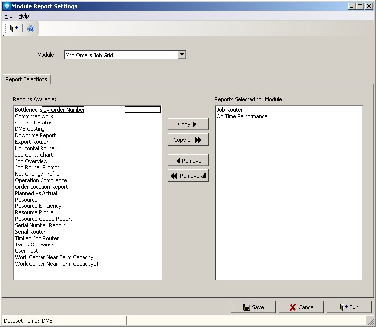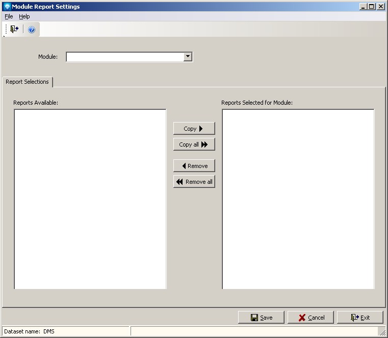 2. Drag and drop or use the buttons to copy reports from Report Selections to Reports Selected for Module.  Those reports listed in Reports Selected for Module will be available for printing from the module.