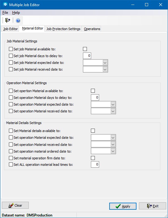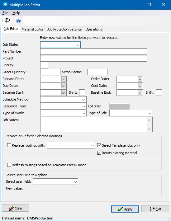 The following fields can be changed using the Multiple Job Editor Material tab. To change a field, select the field you want to change and then make a valid entry for the field. To leave a field as is, do not select the field: