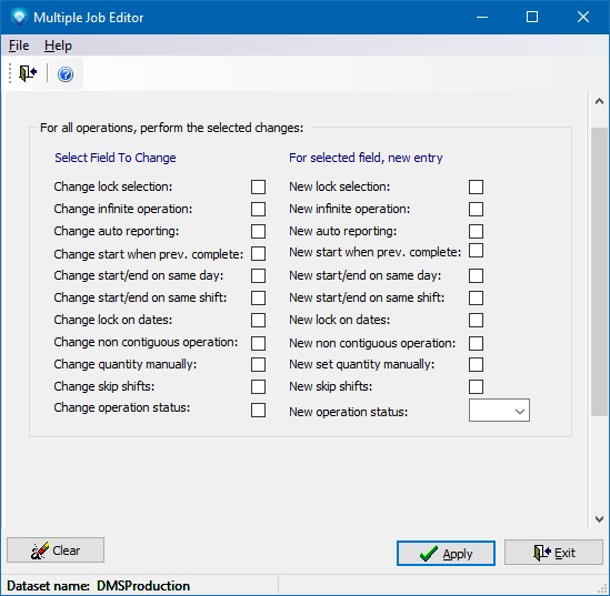 If you enter values for given fields and click the Apply button, all jobs currently in the Mfg Orders grid will have the corresponding fields changed.