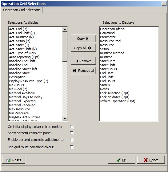 The left list box Selections Available lists the fields that are available but currently not displayed in the operation grid.  The right list box Selections to Display lists the fields that are currently displayed.  If you have any operation user fields defined, they are also listed automatically in the appropriate list box.