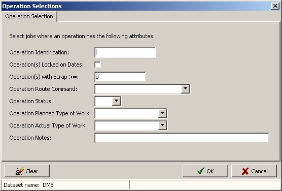 Operation Selections enables you to select jobs based on the operation information. To access operation selections, click on the Operation Selections button on Manufacturing Orders: