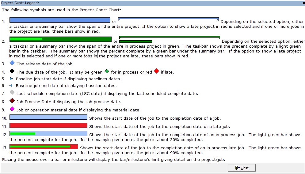 The Project Gantt draws a Gantt chart of jobs that are part of a project as defined by the DMS Job Identification. Projects and their jobs to graph are selected from Mfg Orders Job Grid. A bar is drawn for each project, which is a summary of all the jobs in the project, followed by each job within the project. Note that the projects and jobs graphed are dependent on the selections made in the Mfg Orders Job Grid.