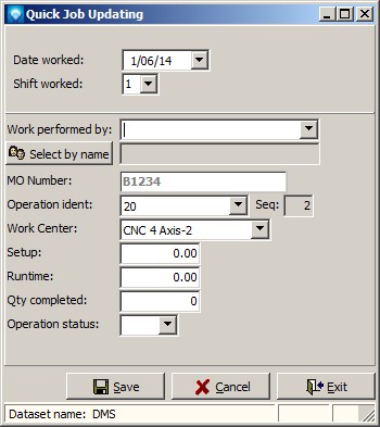 Quick Job Updating is a fast way to update a job with times and quantities. Quick Job Updating is accessed using a right mouse click to popup the update screen. The update parameters of what to display are set in the Job Updating window using the View | Job Updating Options and then select the Quick Updating tab.