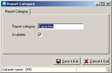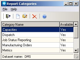 Report Categories are used to group DMS reports into categories in order to simplify and organize the reports. Before a Report Categories can be sued by a report, the Report Categories must be defined. Once a Report Categories has been defined and is used by DMS, it cannot be deleted unless reports using the Report Categories are assigned to another Report Categories. Instead of deleting a Report Categories you can make it unavailable for use by unselecting the Available check box.