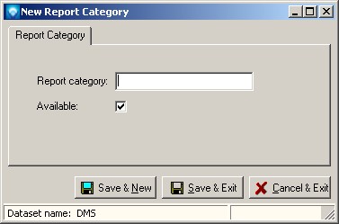 If New was selected, the following window appears. Enter the new Report Category and click the Save & New button to save the entry and keep this screen open to add another new Report Category, or click Save & Exit to save the Report Category. Click Cancel & Exit to ignore the entry and exit the screen: