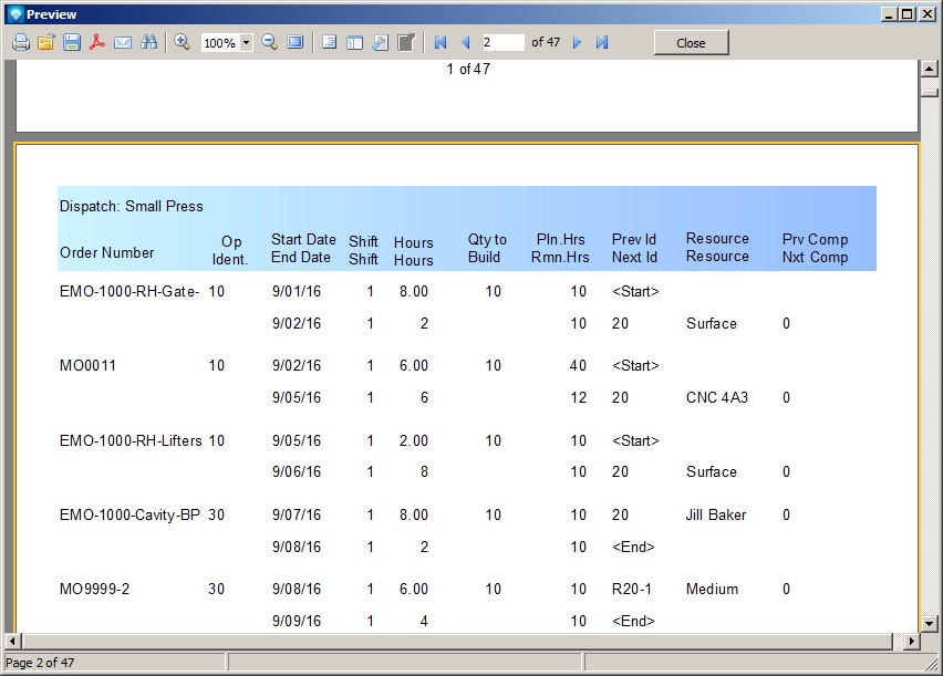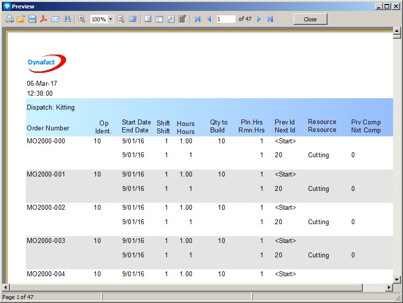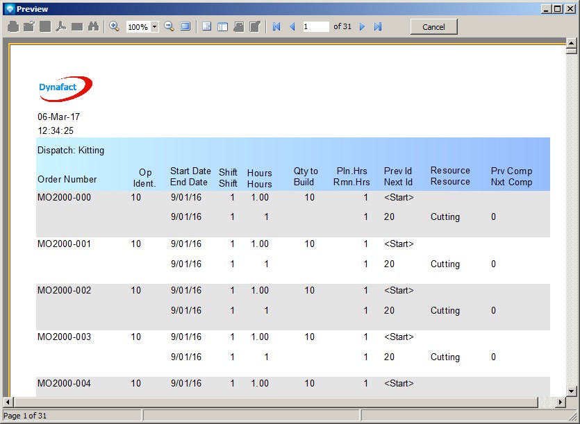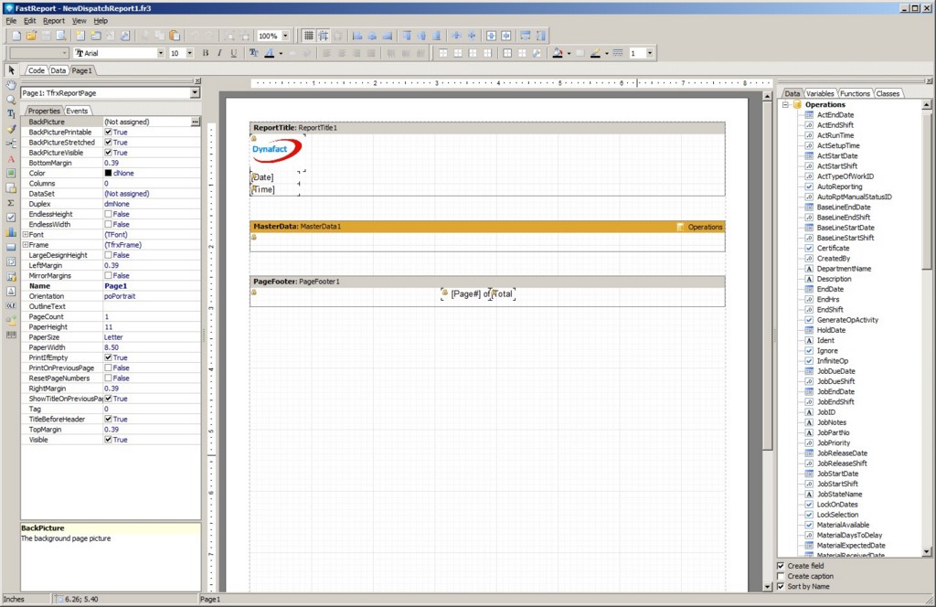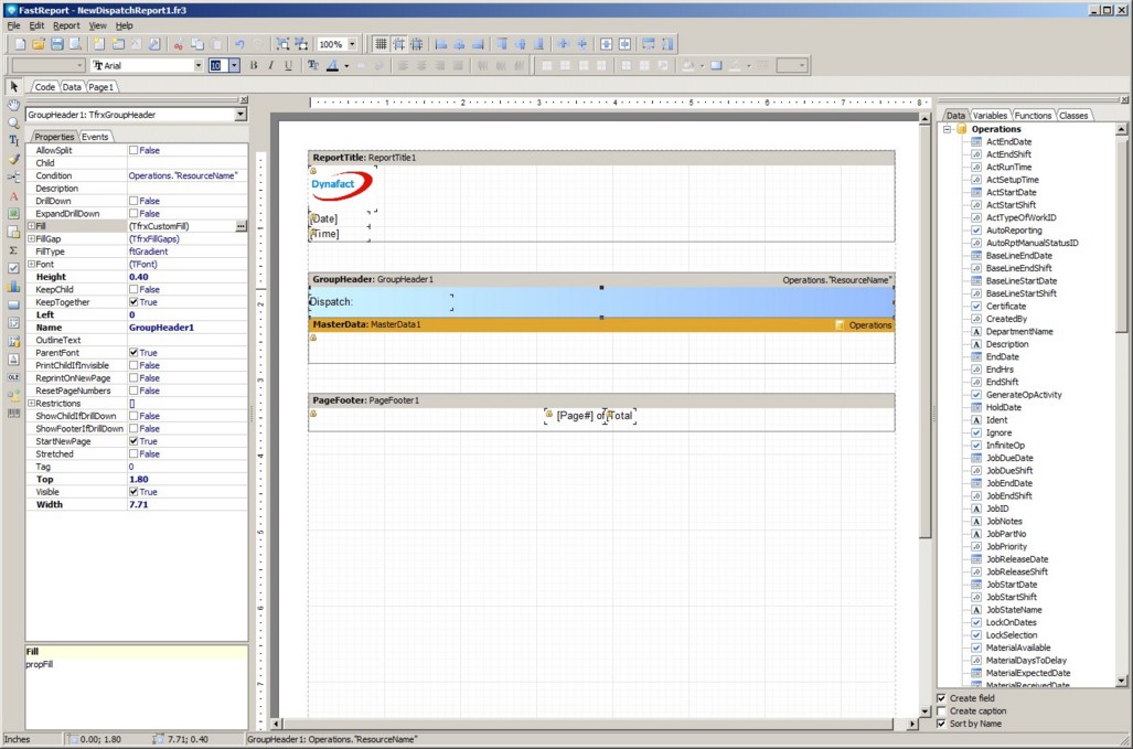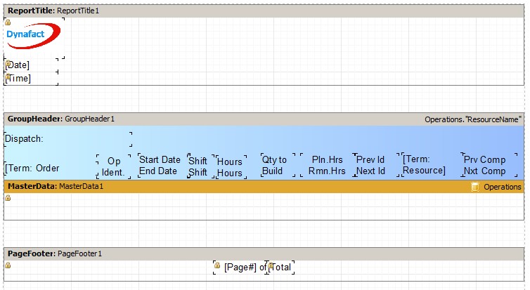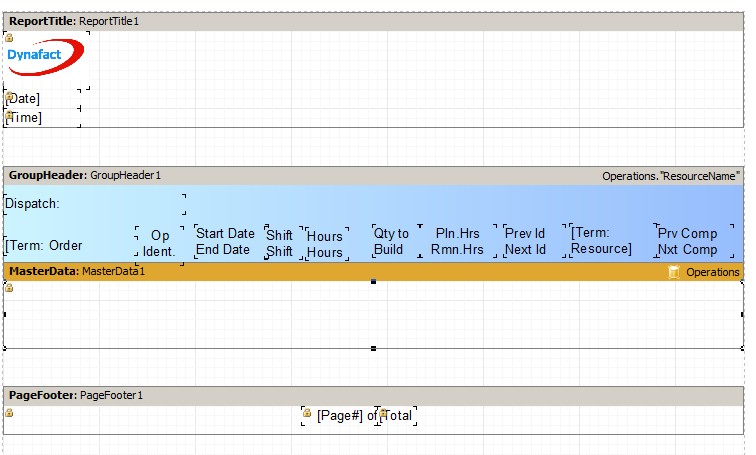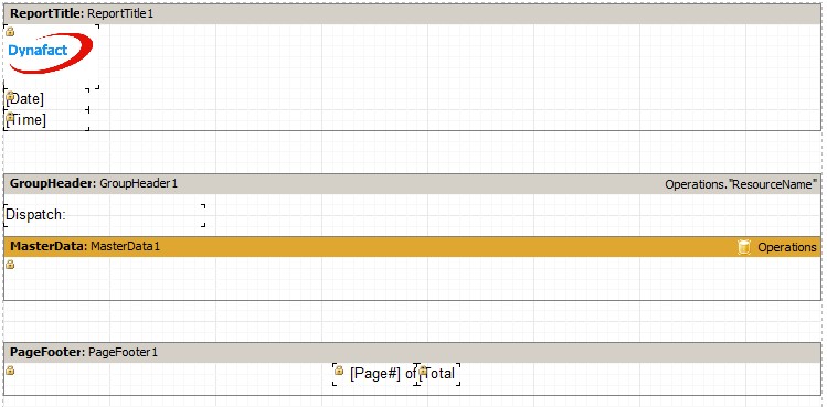 To the Group Header, add the Data field ResourceName to the left side of the Group Header band. Double click on the ResourceName text object you just added and add the work "Dispatch: " to the text as in: Dispatch: [Operations."ResourceName"]. You report work area will appear something like: