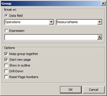 on the Designer Menu Bar and select the Group Header. You will get a popup window similar to the example below. For the Data Field, Operations will be automatically populated. In the second drop down menu, select ResourceName as we will be grouping on the resource name. Select the check box "Keep group together" so that the group information will be kept together, and select "Start a new page" so that each new resource starts on a new page. Click OK: